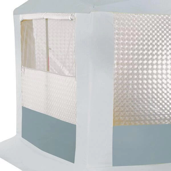 Annexe cuisine pour auvent de caravane Ă©quipĂ© d’un rideau de sĂ©paration et d’une grande moustiquaire + volet avec fermeture.