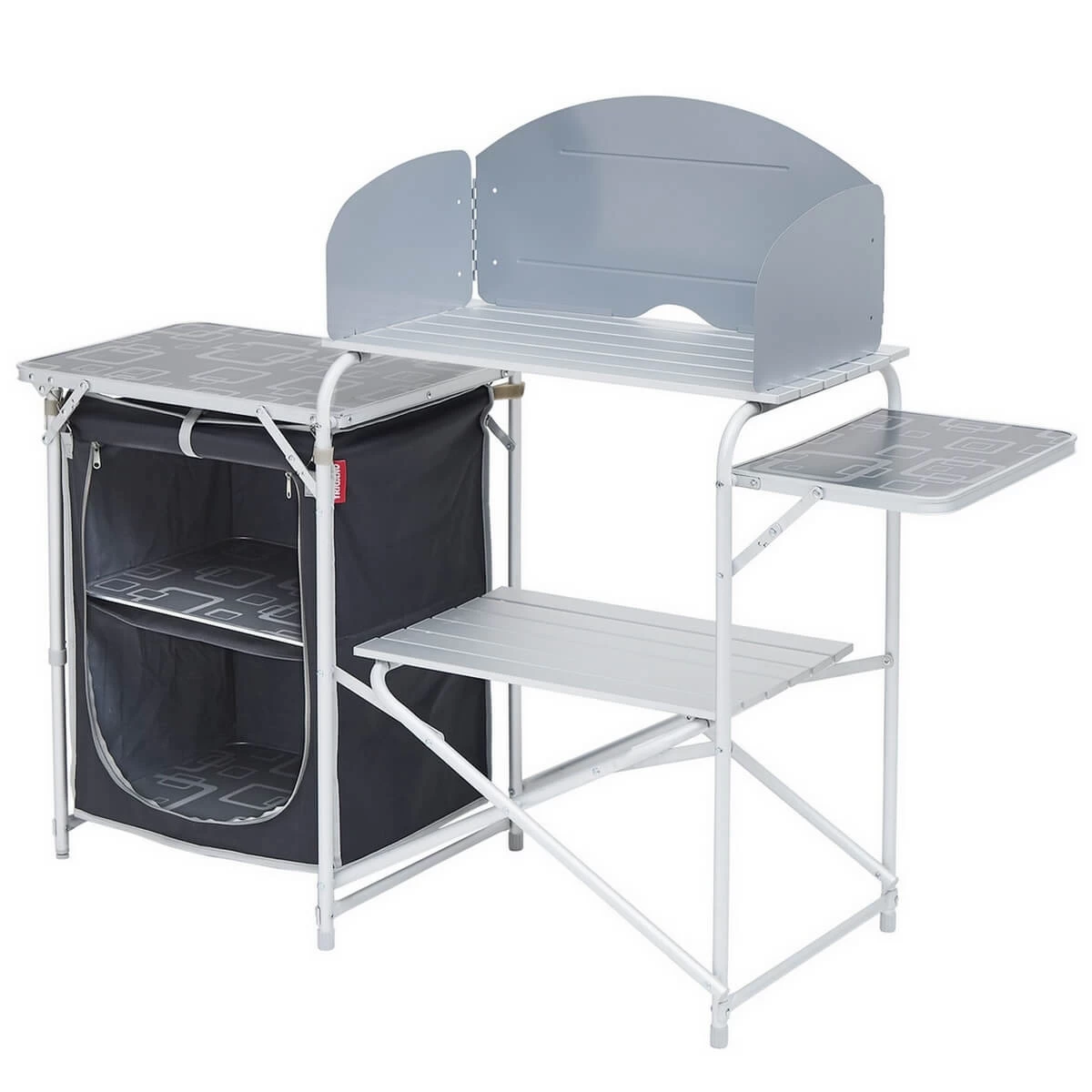 Meuble de cuisine spécial camping constitué d’un plan de travail avec pare-feu, étagère et desserte ainsi que d’un espace rangement refermable en toile avec deux étagères.