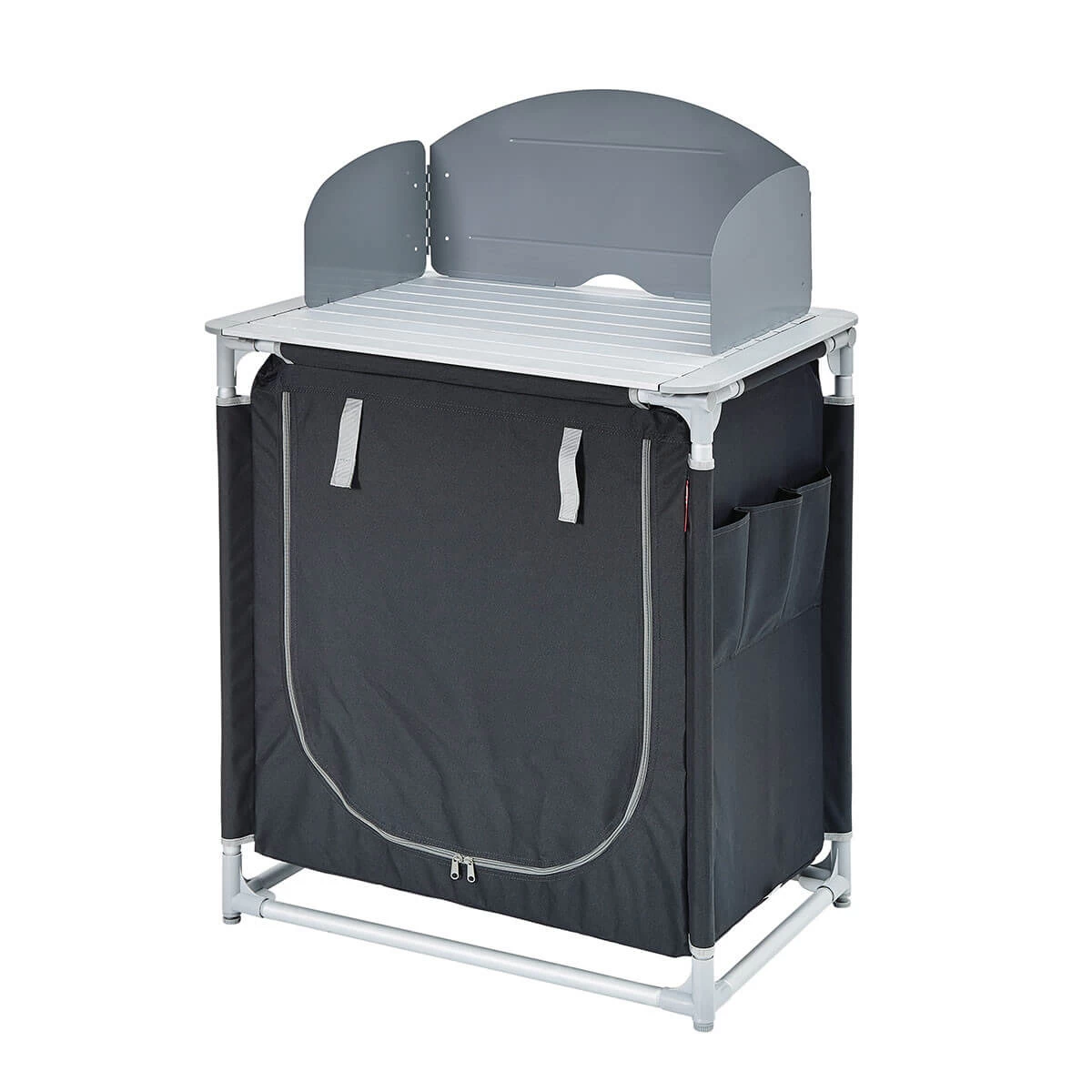 Montage simple et rapide. Ce meuble de camping offre deux grandes étagères, un plan de travail pour y poser son réchaud ainsi qu’un large pare-feu pour cuisiner sans être importuné par le vent.