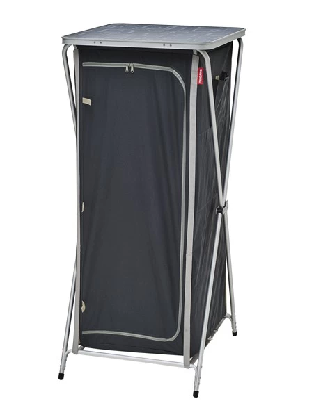 Découvrez notre meuble de rangement camping pliant XL gris/noir avec tablette supérieure amovible.
